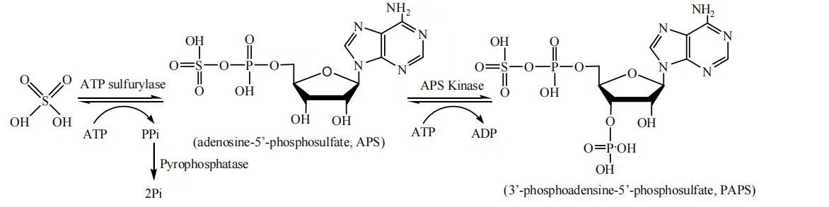腺苷-5'-磷 酰 硫 酸(Adenosine 5'-phosphosulfate,APS)可 在 腺 苷-5'-磷 酰 硫 酸 激 酶(A-denosine 5'- phosphosulfatekinase,APSK)的 催 化下磷酸化APS的3'端羟基生成3'-磷酸-腺苷5'-磷酰硫酸(3'-phosphoadenosine 5'- phosphosulfate,,PAPS)。PAPS是目前发现的唯一的“活性”硫酸基团供体,在多糖等生物分子的硫磺化反应研究中起到重要作用。